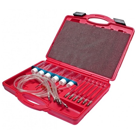 Тестер позволяет проводить статический и динамический тесты и увидеть объем перелива каждой из форсунок в прозрачной калиброванной мензурке или колбе, что позволяет быстро и легко определить неисправную форсунку. Не требует демонтажа форсунок и выявляет их неисправность по неравномерности «обратного сброса». Подключается к каждой электромагнитной дизельной форсунке к обратной ветви слива топлива в бак. Одновременно позволяет подключать до 6 форсунок. Применяется с адаптерами JTC-4777. Предназначен для использования на большинстве систем Common Rail: Bosch, Siemens, Denso и Delphi.
