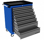 7 ящиков. Оборудована большой прочной пластиковой ручкой. Перфорированные боковые стенки с квадратными отверстиями предоставляют возможность разместить дополнительные аксессуары для хранения инструментов. Роликовые направляющие с функцией автоматического возврата обеспечивают плавность открывания/закрывания секций. Колеса из термопластичного каучука, обеспечивают легкое и бесшумное перемещение тележки. Наличие центрального замка