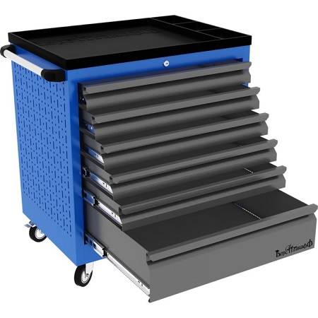 Верстак однотумбовый поставляется в разобранном виде. Нагрузка на столешницу до 600 кг. Стандартный цвет: корпус - серый глянец RAL 7030, ящики и двери тумб - синий RAL 5017. Размеры:855x1800x700 мм. Вес: 72 кг.