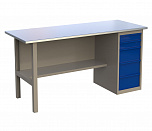 Однотумбовый. Допустимая нагрузка на столешницу 750 кг. Опорные элементы выполнены сварными из холоднокатаной стали. Для выполнения сборочных, ремонтных, слесарных, монтажных и других видов работ на производстве, в сервисных центрах, мастерских, гаражах, а также для обучения технологии в учебных заведениях. Комплектуется полкой-стенкой, расположенной под столешницей для удобного размещения габаритного инструмента и оснастки. Размеры верстака: 855x1596x696 мм. Вес: 68 кг. Поставляется в 4 комплектациях на выбор.