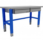 Верстак бестумбовый поставляется в разобранном виде (4 места). Нагрузка на столешницу до 600 кг. Стандартный цвет: корпус - серый глянец RAL 7030, ящики и двери тумб - синий RAL 5017. Размеры: 855х1000х420мм. Вес: 24 кг.