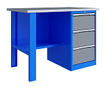 Однотумбовый. Допустимая нагрузка на столешницу 750 кг. Опорные элементы выполнены сварными из холоднокатаной стали. Верстак состоит из столешницы, опоры, тумбы P3 с тремя большими ящиками, полки-стенки и одинарного экрана с кронштейнами. Все металлические элементы покрыты полиэфирной порошковой краской. Столешница состоит из фанеры марки ФСФ толщиной 24 мм, которая покрыта лаком-антисептиком и листом оцинкованной холоднокатаной стали толщиной 1,2 мм. Размеры (ВхШхГ) 1470x1196x696 мм.