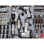 Полный набор пневмоинструмента слесарный – 71предмет. Гайковерт слесарный 320Nm, для болтов 11-19мм. угловой гайковерт 68Nm”, зачистная машинка 22000 об/мин, пневмозубило с набором зубил, продувочный пистолет, набор бит, набор ударных головок, набор быстросъемов, набор шарошек, набор абразивных наконечников, переходники и масло.