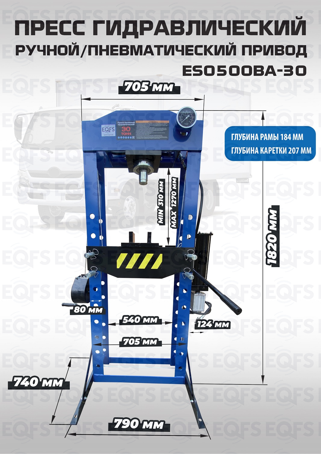 Полностью сварная рама - усилие 30 тонн, управление ручное/пневматическое, клапан защиты от перегрузки, манометр, ручная лебедка, гидроцилиндр с пуансоном перемещается по всей ширине каретки. Ход поршня 150 мм. Рабочее окно 540х1270 мм. Рекомендуется для выпрессовки подшипников, деталей машин, втулок и т.п. в автосервисе, Гараже и СТО. Доставка РФ, РБ, Армения, Казахстан, Киргизия.