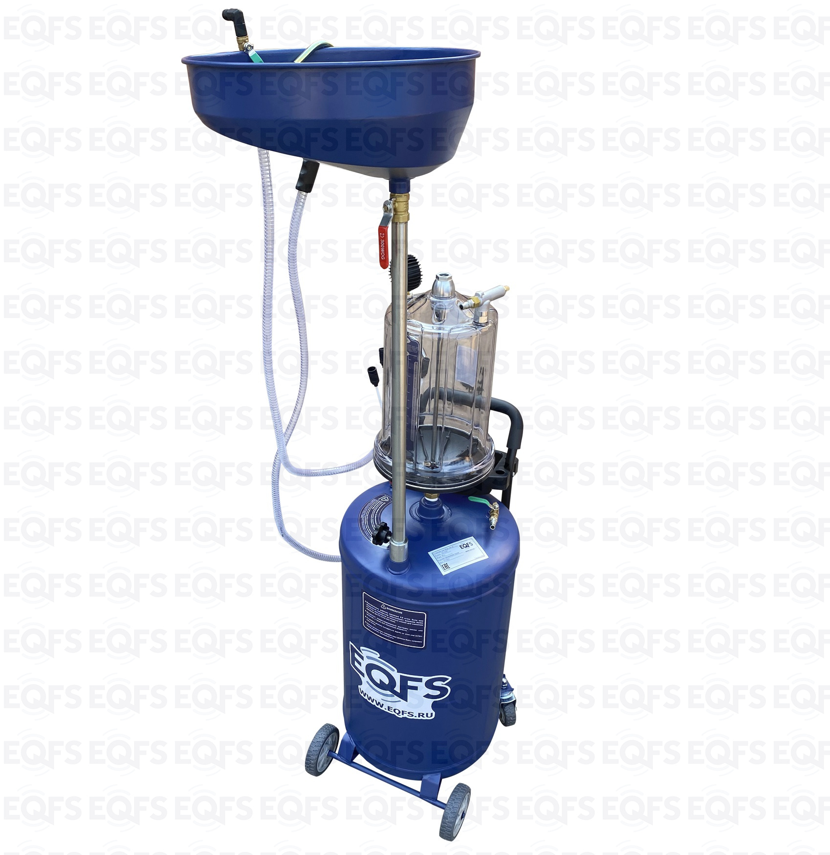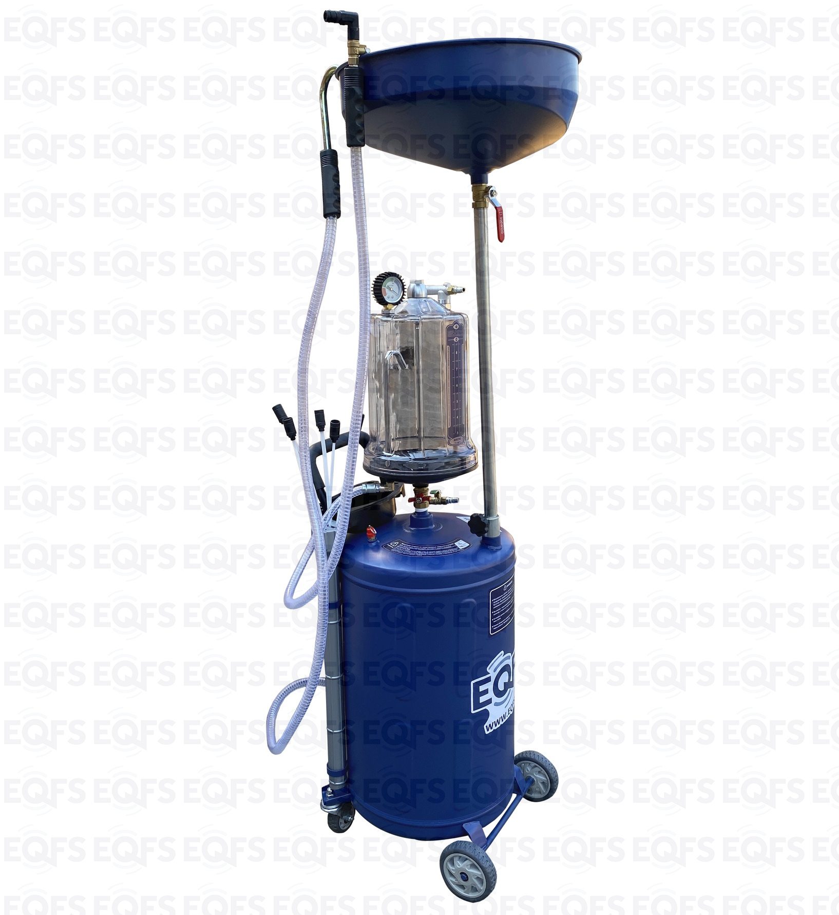 Установка для слива и откачки щупами масла и антифриза из ДВС, КПП и мостов. В комплекте: Колба с особо прочным пластиком + Сливная чаша с сеткой для улавливания мелких деталей + Щупы гибкие 5 шт. + Лоток для сливной пробки + Металлические пистолеты для откачки масла + визуальный контроль уровня отработки+ стрелочная индикация уровня разрежения в установке + Быстросъёмный штуцер для пневмолинии + Сепаратор для выхода воздуха. Вмещает 100 л. = Бак 80л + колба 10 л. + сливная воронка 10л.