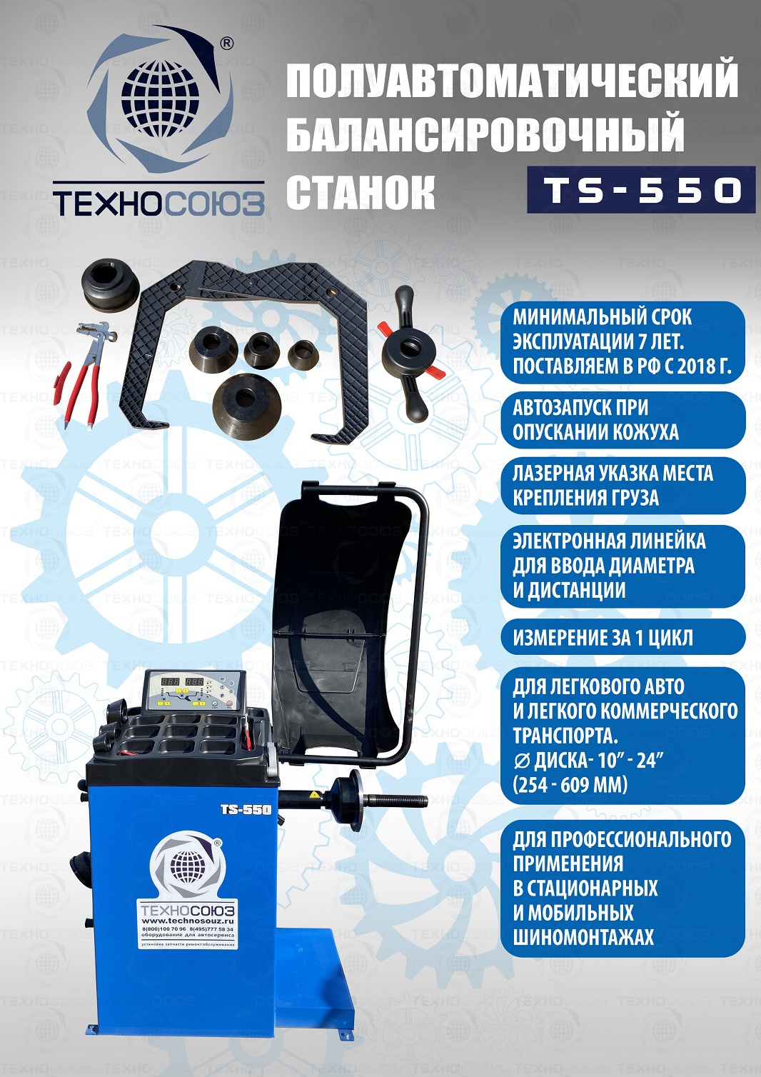TS-550 Балансировочный станок (с лазером) Полуавтомат. Удобный и понятный интерфейс. Автозапуск опусканием кожуха. Автоматический ввод дистанции и диаметра диска. Лазерная навигация. Автокалибровка. Для колес легковых автомобилей, мотоциклов, «Газелей», «Спринтеров» с диаметром диска с резиной до 800 мм. Размеры диска: ширина 3–10” (76-254 мм), диаметр диска 10–24” (254÷609 мм). Вес ≤ 65 кг. Вал- 36 мм. Точность ±1гр. 220 В. Режимы работы DINAMIC, STATIC, ALU1, ALU2, ALU3, ALUS, ST. Гарантия 12 мес. В комплекте: кожух с автозапуском + клещи + кронциркуль + быстрозажимная гайка + набор конусов.