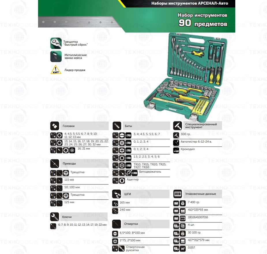 Набор инструментов 90 предметов AUTO Арсенал AA-C1412L90 имеет хороший подбор головок, ключей комбинированных, бит и отверток. Идеально подходит тем, кто хочет иметь молоток и клещи переставные в кейсе среднего размера. Сталь, из которой изготовлен инструмент, легирована хромом и ванадием с нанесением никелевого покрытия. Крепкий кейс из ударопрочной пластмассы. Наборы инструментов Арсенал имеют пожизненную гарантию.  Инструмент Арсенал - Специально разработан для Российских условий!!!