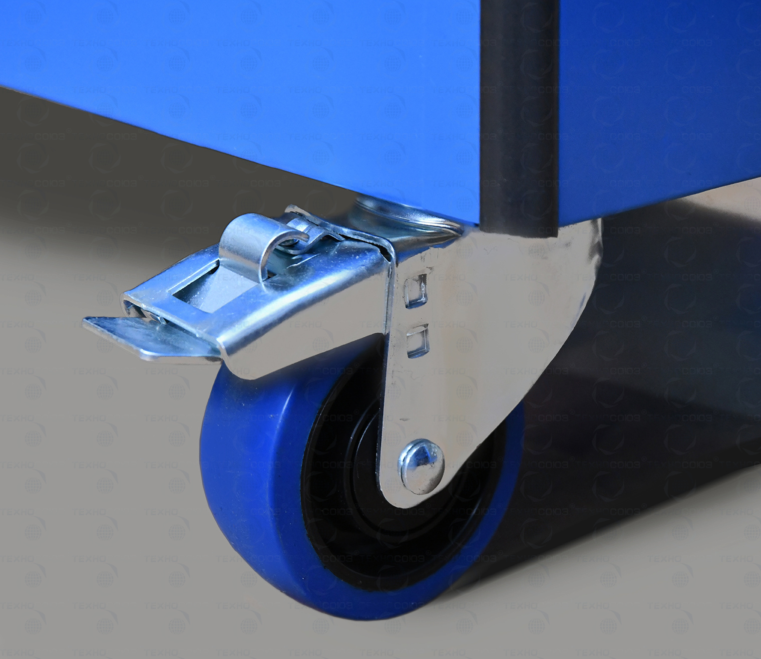 Тележка оснащена четырьмя колесными опорами с диаметром колеса 100 мм. Две колесные опоры неповоротные, одна колесная опора поворотная без тормоза, одна колесная опора поворотная с тормозом.