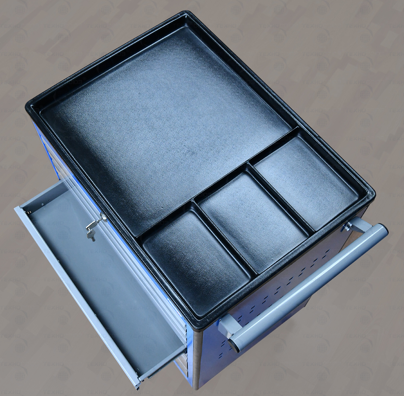 Тележка снабжена центральным замком с поворотом ригеля 180 градусов, который закрывает одновременно все ящики. Замок неподвижно и прочно закреплен на корпусе тележки. В комплекте имеется два ключа. Тяга замка подпружинена.