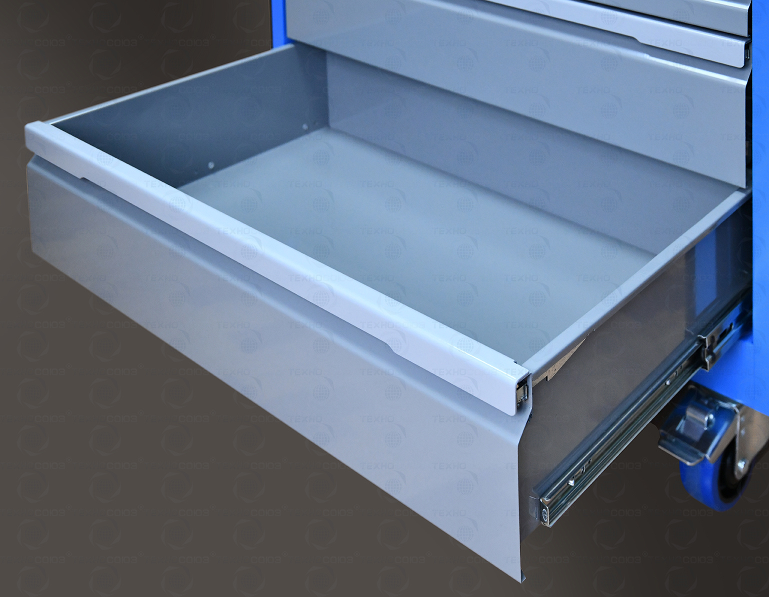 Ящики устанавливаются на шариковых телескопических направляющих полного выдвижения. Обеспечен свободный и плавный ход ящиков даже при полной загрузке. На лицевой панели каждого ящика установлена ручка-накладка. Каждый ящик снабжен клавишной системой антиоткрывания из оцинкованной стали, препятствующей самопроизвольному выдвижению ящиков, например, при наклоне или перемещении тележки.