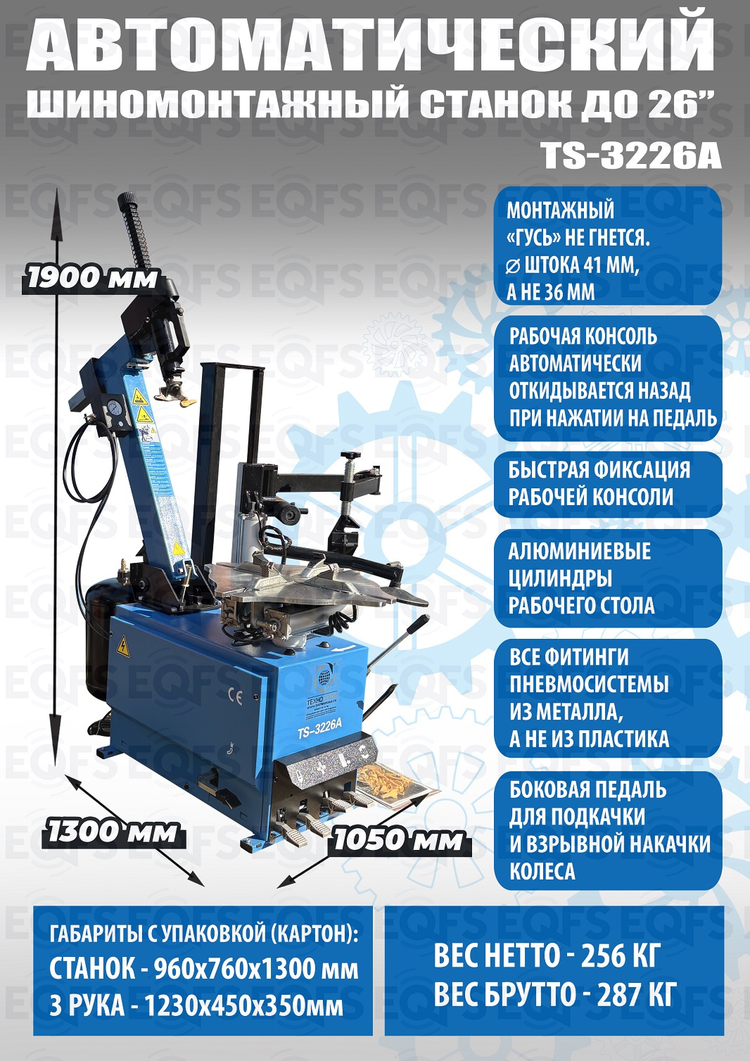 TS-3226A Станок шиномонтажный автоматический до 26". Надёжный автомат - рекомендуем. Для больших и широких колес. В комплекте бустер емкостью 24 литра (взрывная подкачка) + третья рука для работы с низкопрофильными шинами и RanFlat. Размеры дисков: снаружи 12÷24", изнутри 14÷26". Максимальное колесо: Ø 990x355 мм.  220/380В. Масса: 256 кг. Гарантия 12-18 мес