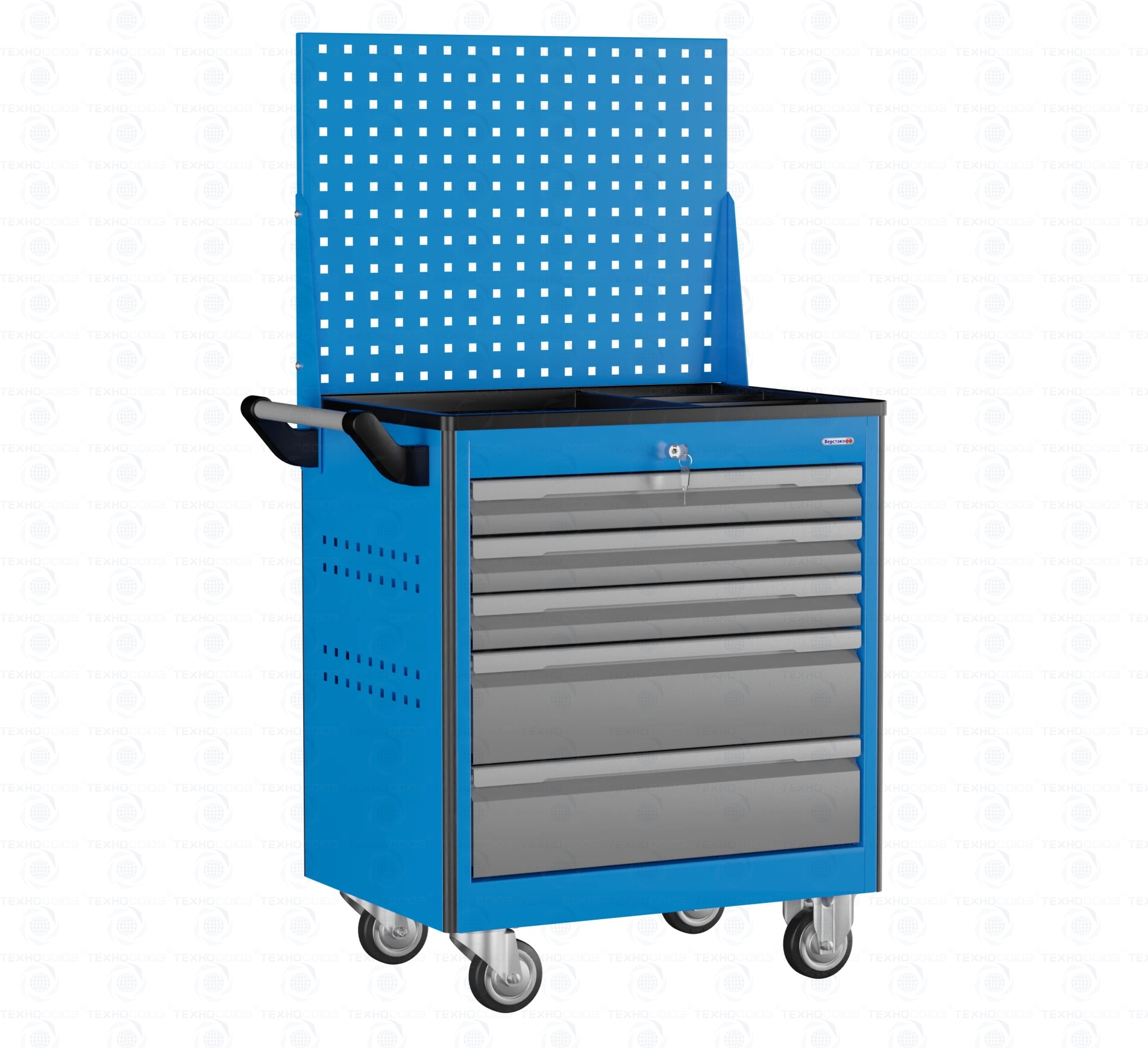 5 ящиков и перфорированный экран. Нагрузка на тележку 220кг. Корпус тележки сварной. Тележка оснащена системой антиопрокидывания новой конструкции, которая блокирует открывание ящиков. На боковых стенках корпуса выполнена квадратная перфорация для установки крючков, держателей и других аксессуаров. Ящики на шариковых телескопических направляющих полного выдвижения. Обеспечен свободный и плавный ход ящиков даже при полной загрузке. Габаритные размеры тележки с учетом колес, лотка и ручки (ВхШхГ), не более: 808х780х490 мм. Вес: 48,4 кг.