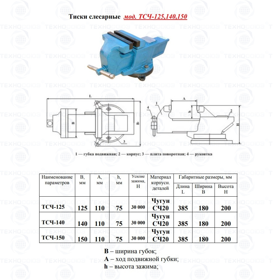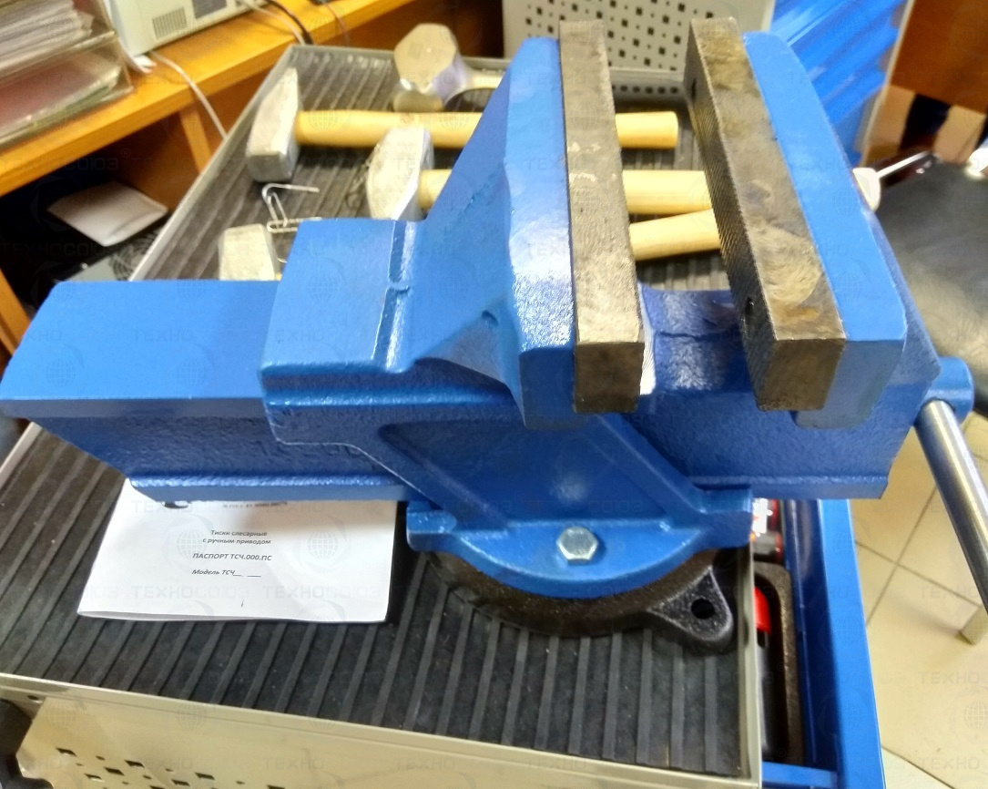 ТСЧ-125 тиски слесарные поворотные 0°-360° с наковальней. Материал: чугун СЧ20 (серый чугун) ГОСТ 1412-85. Губки сменные 125мм. Ход 110мм. Зажим 3059кгс. Вес: 13 кг. Габариты: 385х180х200 мм. Сделано в Белоруссии. Гомельский механический завод